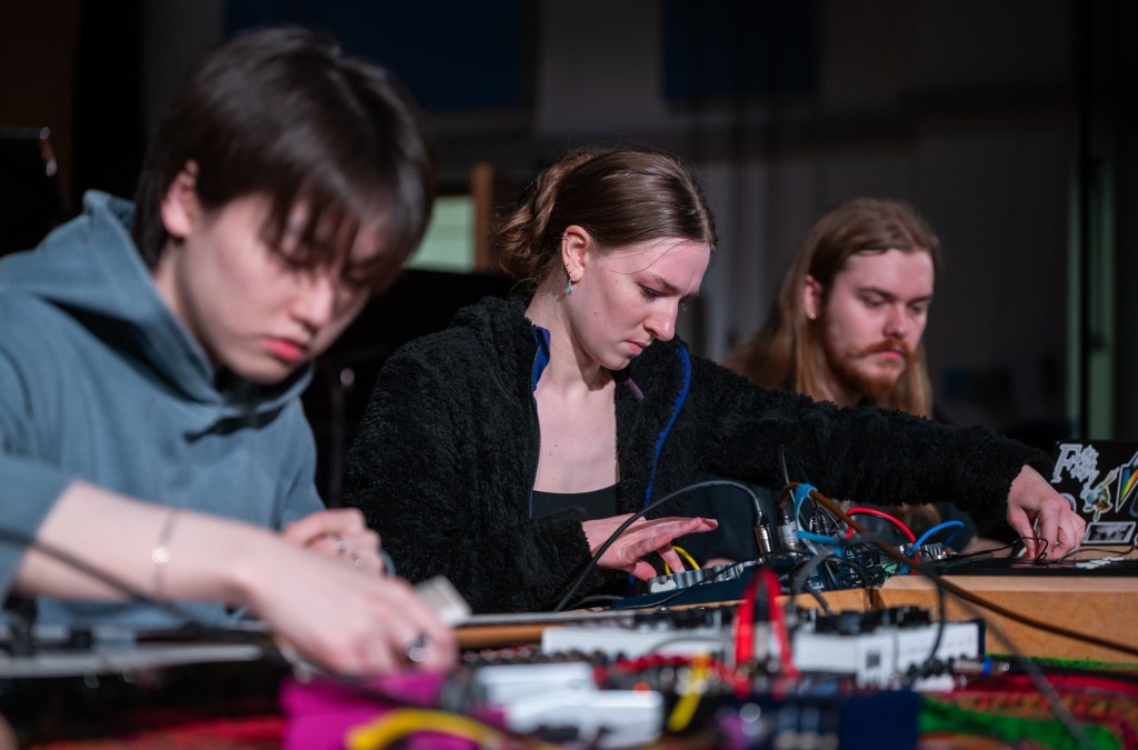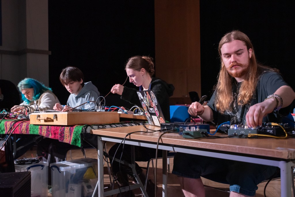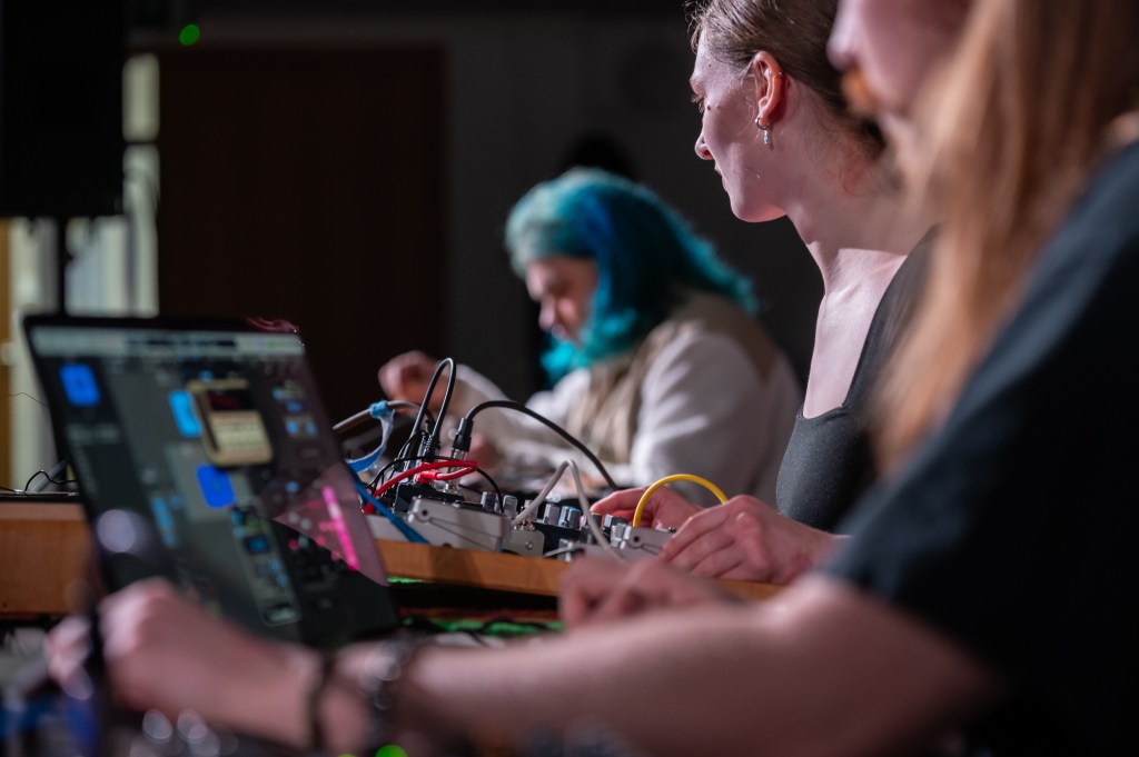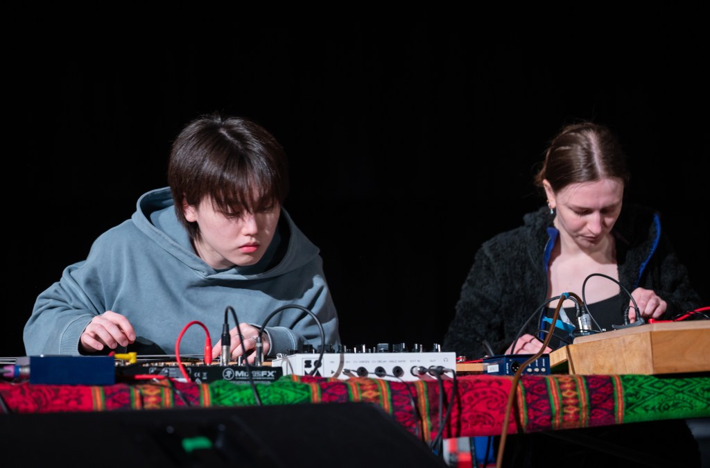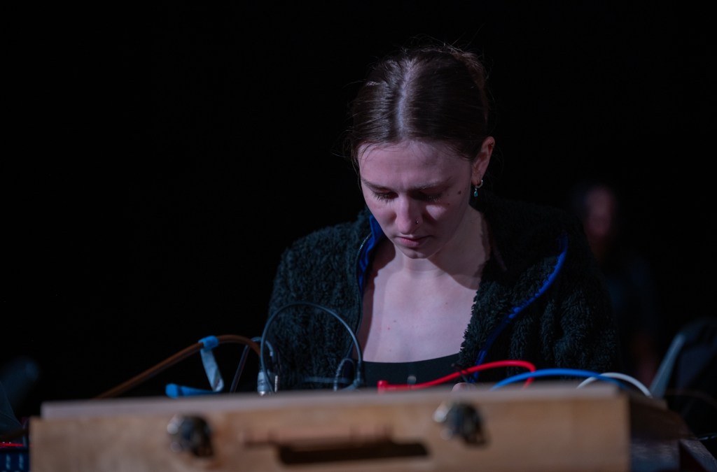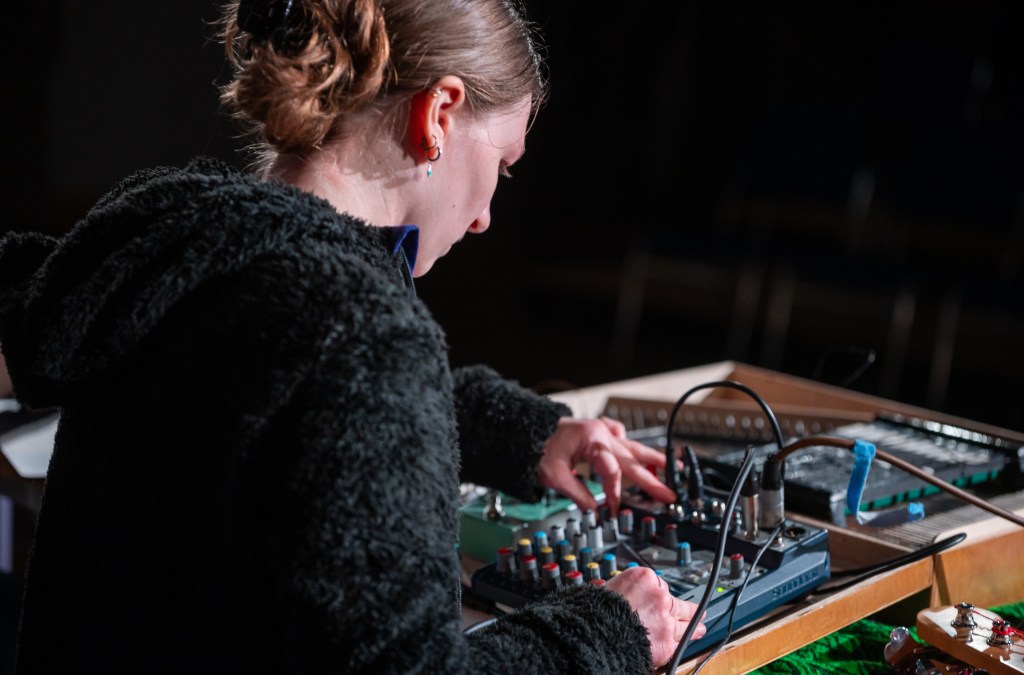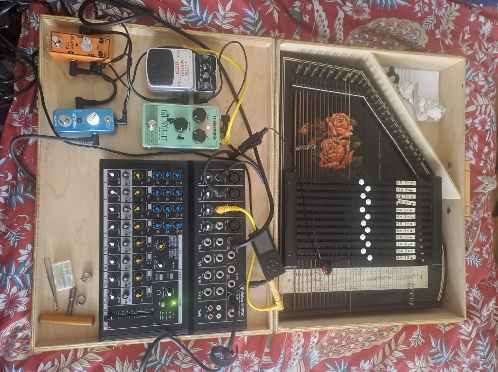 Last night saw the event of Intraspect VIII, which is an annual concert put on by the University of Surrey’s Creative Music Technology course. As part of the group Tsiren, I performed alongside Alex Tunstall, Dongkyung Yu, and Matthew Veris-Reynolds, with a set up based on no-input mixing principles, using a mixer and a variety of (cheap) guitar pedals to manipulate intentional feedback loops. My own set up featured autoharp on the table top, amplified by multiple contact mics, creating a variety of textural sounds alongside and integrating into the feedback lo0p. Here’s a slightly older version of this setting; I’ve since gained a different mixer, swapped out the distortion pedal for a reverb pedal, which helps make an atmospheric drone-y sound I really like, and gotten rid of the mp3 player, instead finding ways to amplify the autoharp more successfully.