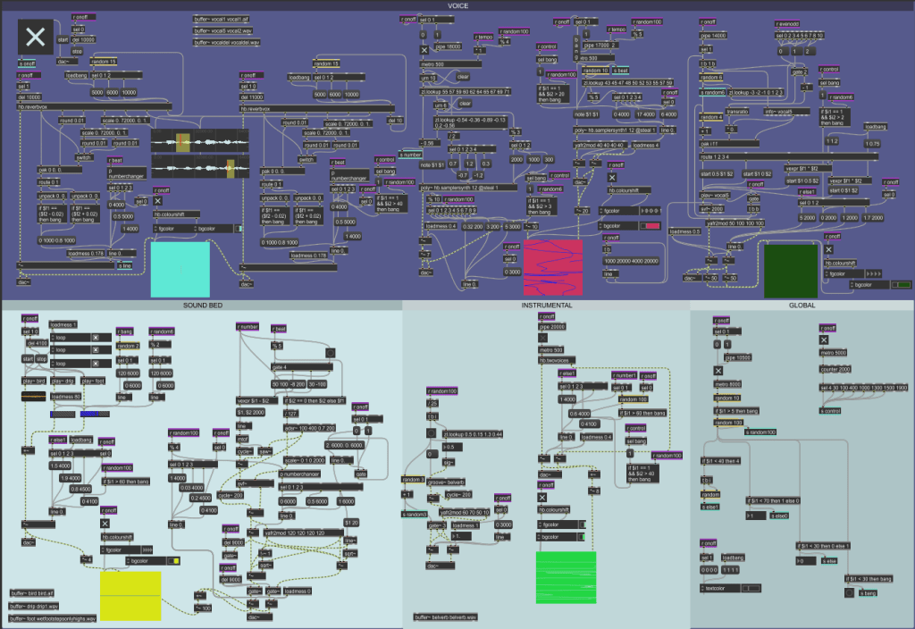 This patch was made as coursework in Max/MSP and is a modular note generator, with 7 individual synthesiser voices. The user can interact with the patch to change certain parameters that effect the direction of the piece through probability.